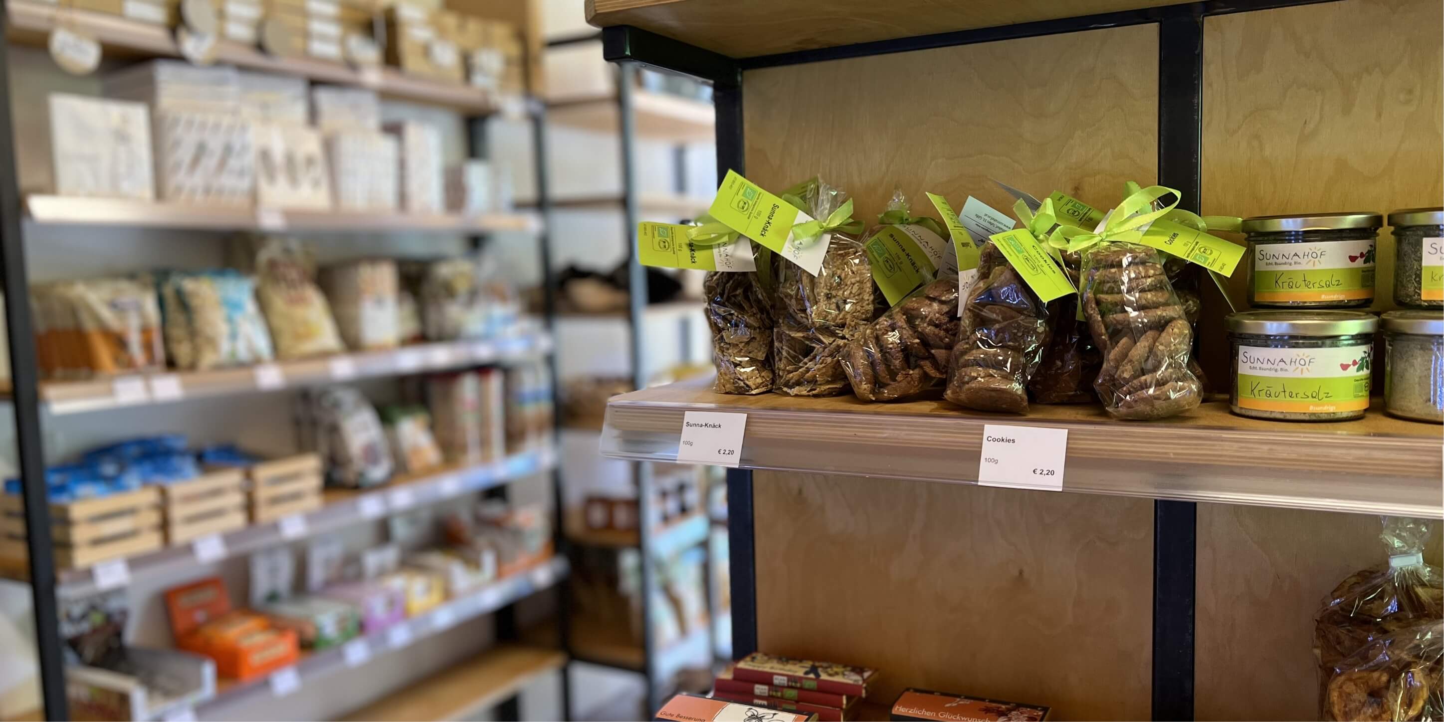 Unser Hofladen am Sunnahof bietet eine breite Auswahl an biologischen Produkten aus eigener Herstellung. Hier finden Sie Obstsäfte, Kräutertees und Essig-Spezialitäten, die mit Kräutern aus der eigenen Gärtnerei verfeinert wurden. Außerdem gibt es frische Bio-Eier aus eigener Haltung und hochwertige Bio-Fleisch- und Wurstprodukte.